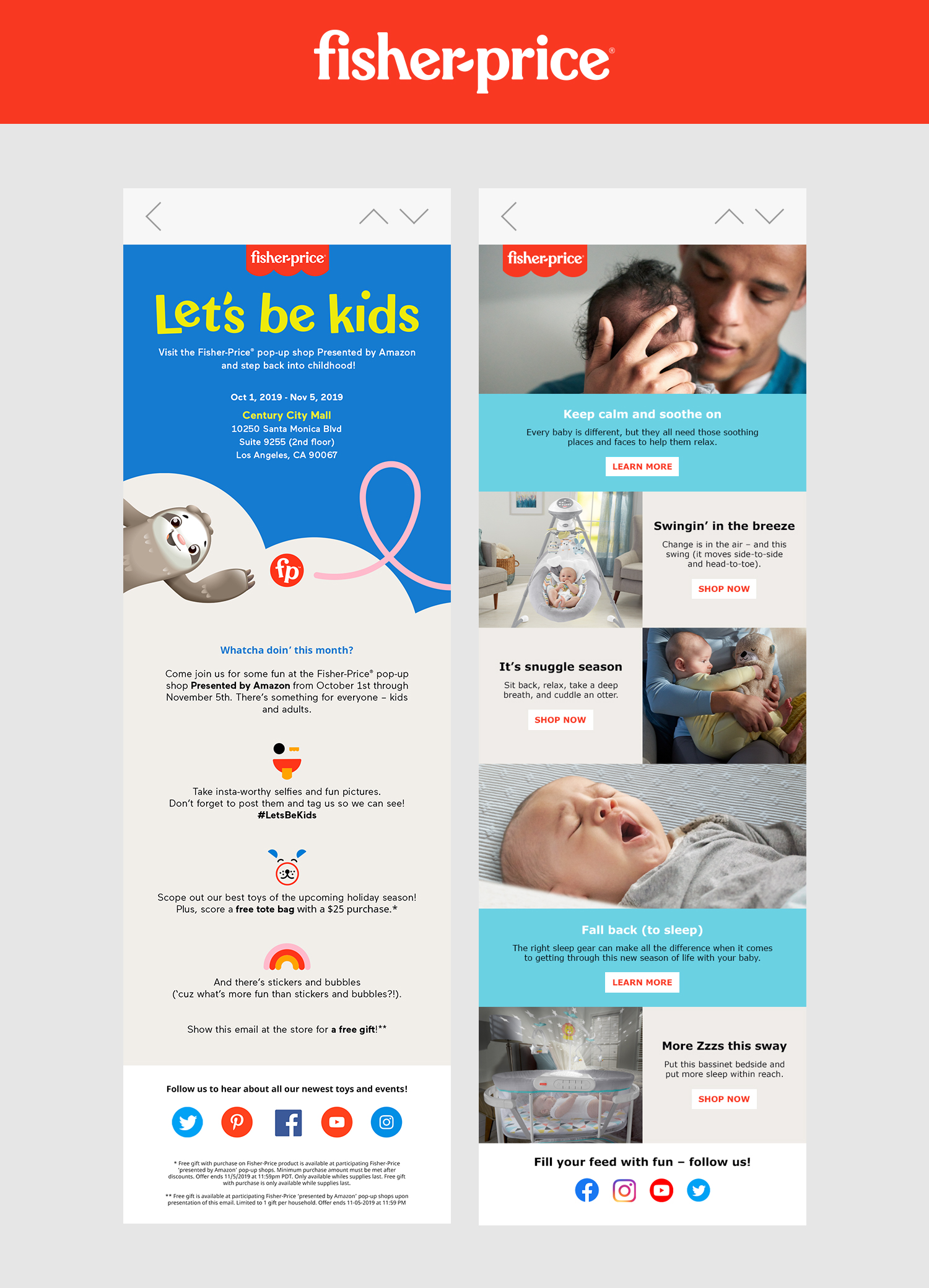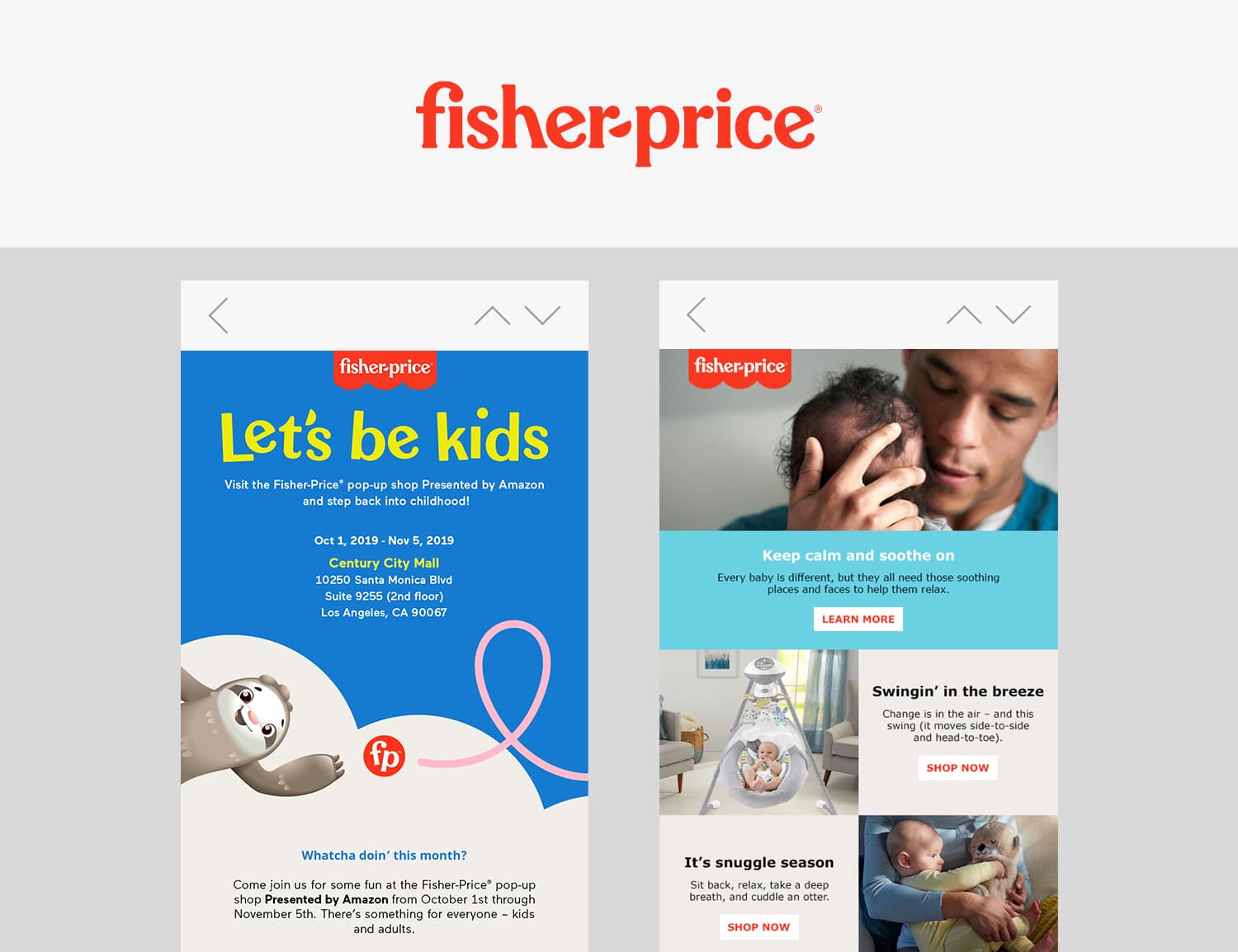 I created and led the design of a wide range of digital assets, such as brand email campaigns, banner ads and social media content. I married the playfulness and vibrant colors of Fisher-Price with my style of clean and simplistic design.