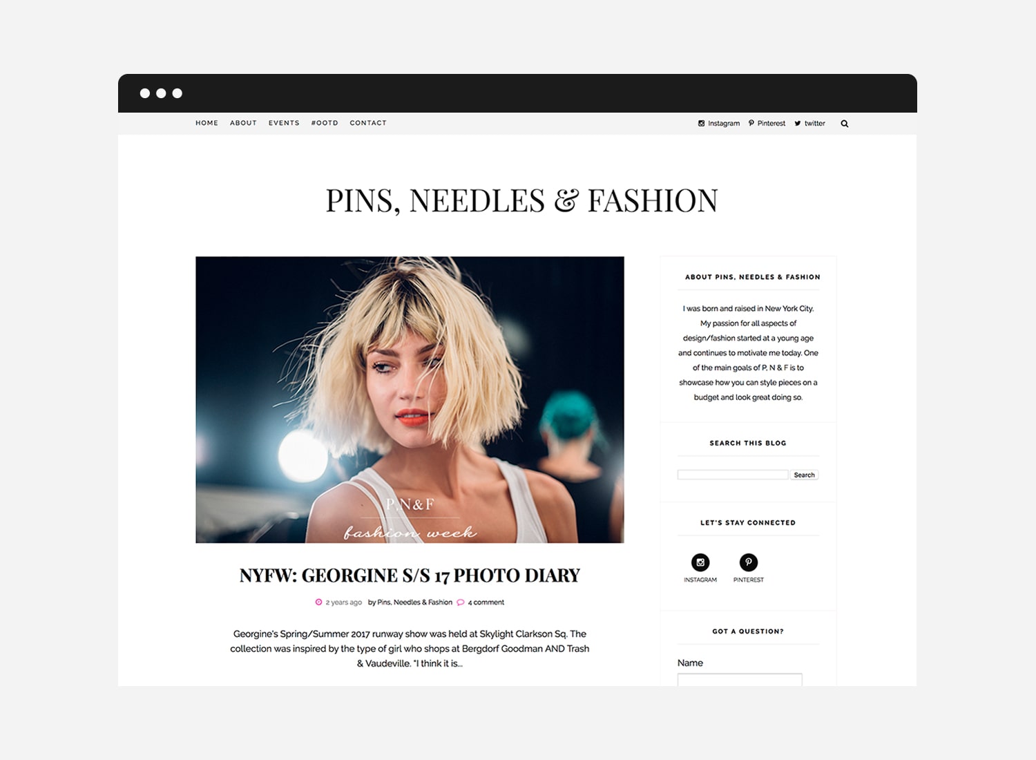 Pins, Needles & Fashion is my personal fashion and lifestyle blog, where I have covered NYFW shows for 8 seasons. I have written reviews and interviewed designers for my personal blog as well as other fashion websites. Past runway shows include designers Michael Costello, Rebecca Minkoff, Rebecca Taylor, Herve Leger by Max Azria, Catherine Malandrino and Georgine.