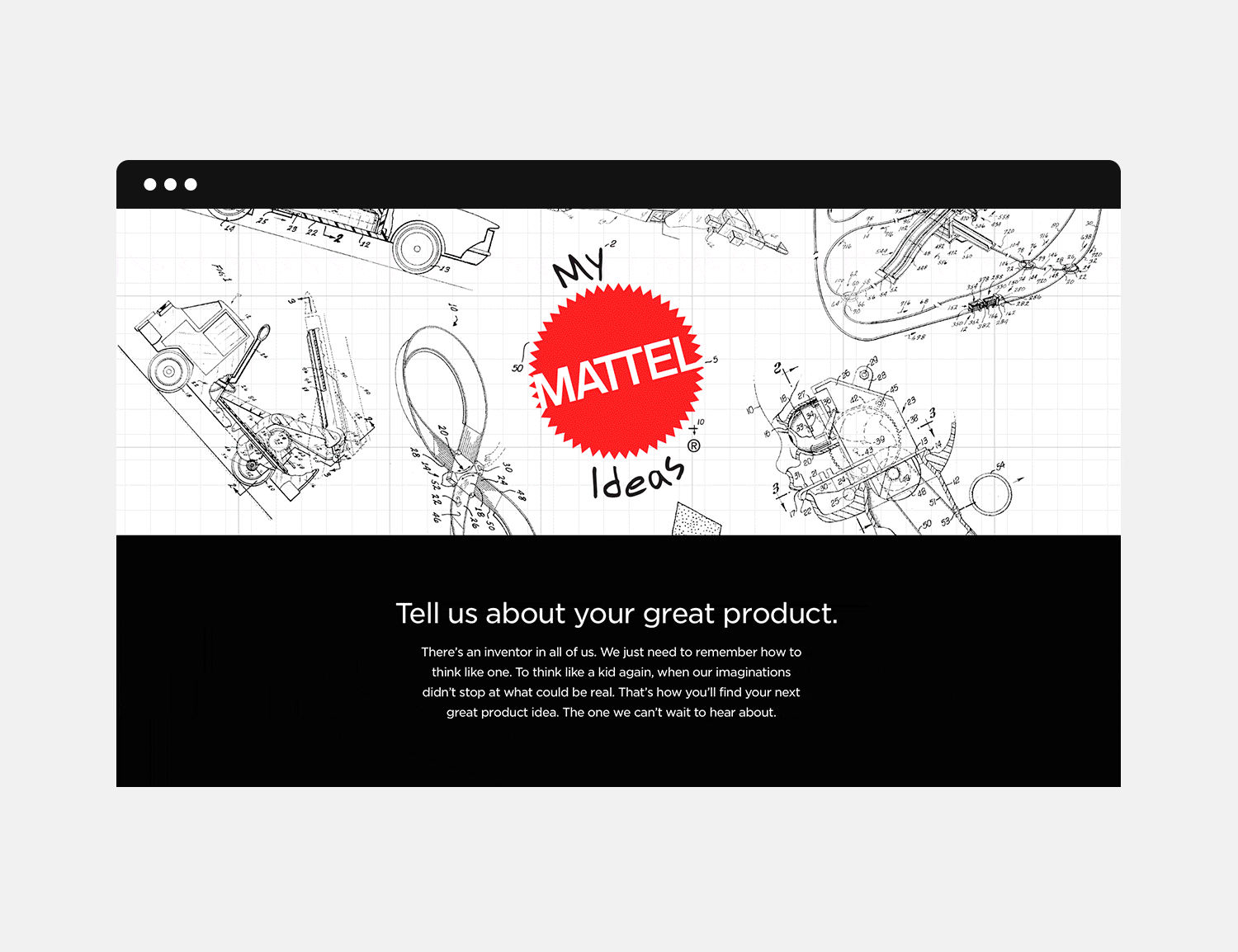 My Mattel Ideas is a microsite on Mattel.com. The website showcases successful Mattel products using ideas from outside inventors. The website also allows people to submit their toy invention concepts for future consideration.