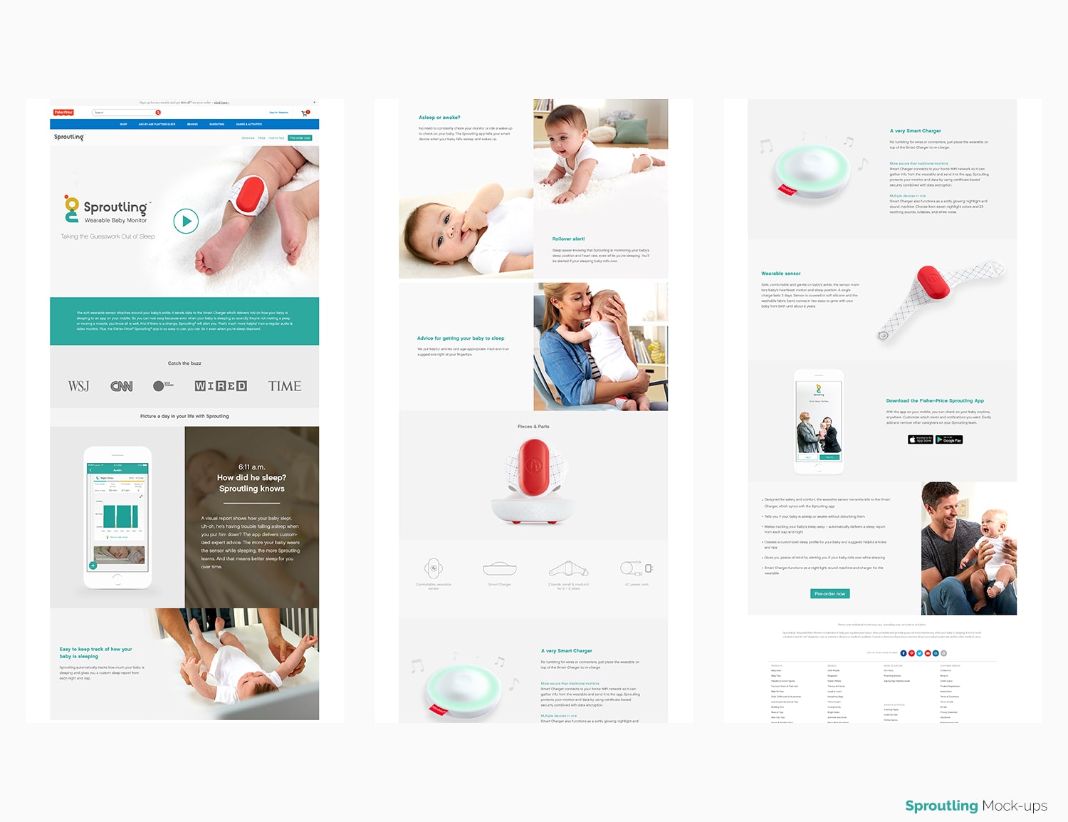 Sproutling is a wearable baby monitor from Fisher-Price. The microsite blends together a mobile responsive landing and product page to introduce the latest tech product.