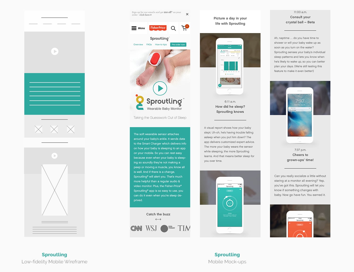 I created and led the design from initial concept to the final mock-ups including designing all low and hi-fidelity wireframes. The vision for the microsite was to create a clean and user-friendly design that ties into Sproutling's sleek modern technology. In the "A day in the life" section, the use of videos and parallax scrolling, highlights the important times Sproutling is there to help.